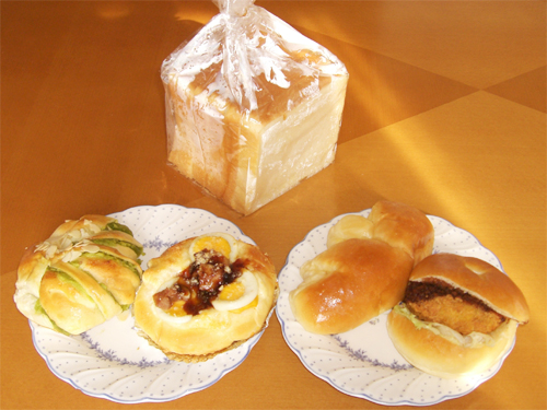 家に帰って早速いただきました。正式名称はわかりませんが今回買ったのは左から、うぐいすあん120円、照焼きタマゴ130円、クリームパン120円、キャベツメンチ140円、それと食パン1斤190円。