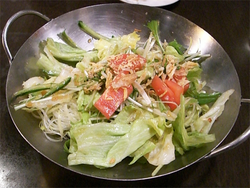 中華なべのような器に水菜やレタス、きゅうり、ねぎなどの生野菜、その上にワンタンの皮?を揚げたのが乗ってます。かかっているのはバーミヤンオリジナルドレッシングだそうですが、けっこう濃目の中華ドレッシングでした。
