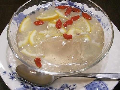 台湾のデザートで「愛玉子」と書くらしいです。プルプルの弾力のあるゼリーや寒天のようなもので不思議な食感。上に乗った赤い実はクコの実?レモンとシロップが甘酸っぱくてさわやかなデザートです。