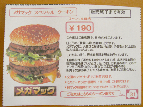 メガマック370円→190円のお得なクーポン。メガマックが買えなかった人に渡しているようです。