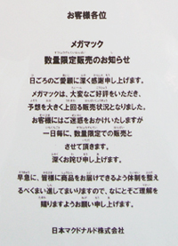 各レジの脇には数量限定販売の張り紙↑があり、メガマックは既に売切れ・・・。メガマックは白岡でも人気のようです。